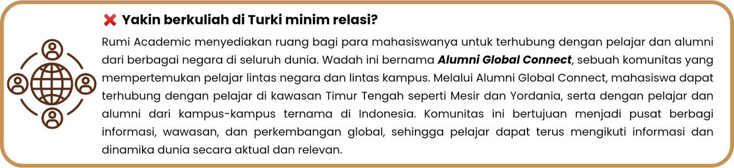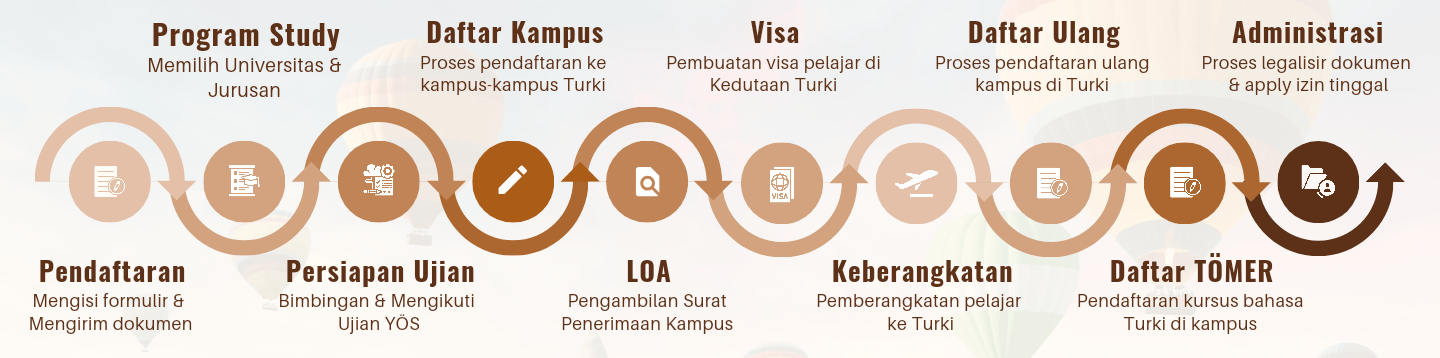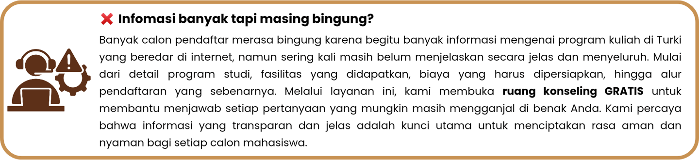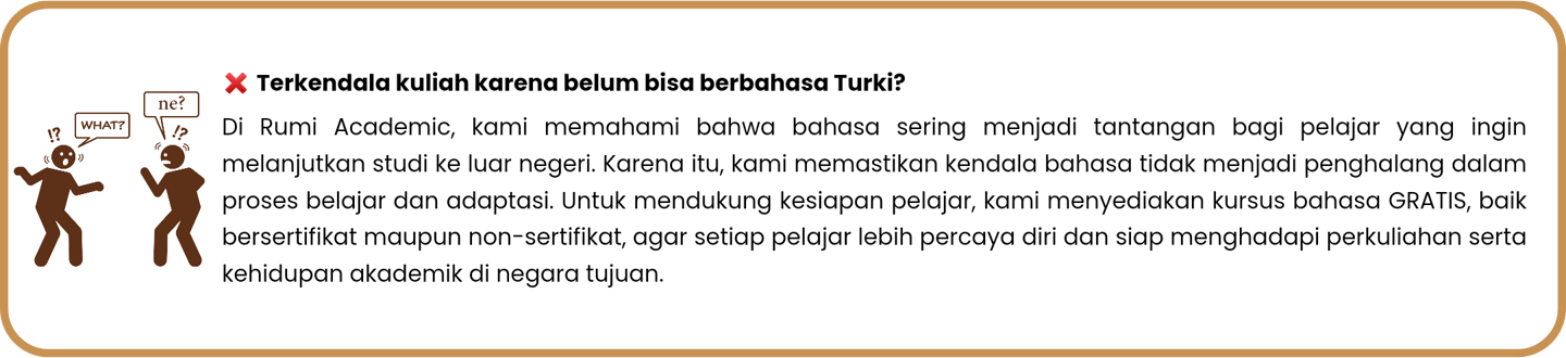 Kami siap nemenin kamu dari awal sampai berangkat. Mulai dari program kuliah di universitas Turki, bimbingan beasiswa, kursus bahasa Turki, bimbingan ujian masuk PTN/PTS Turki, hingga tour & travel, semua kami siapkan dalam satu layanan yang jelas, rapi, dan terpercaya.